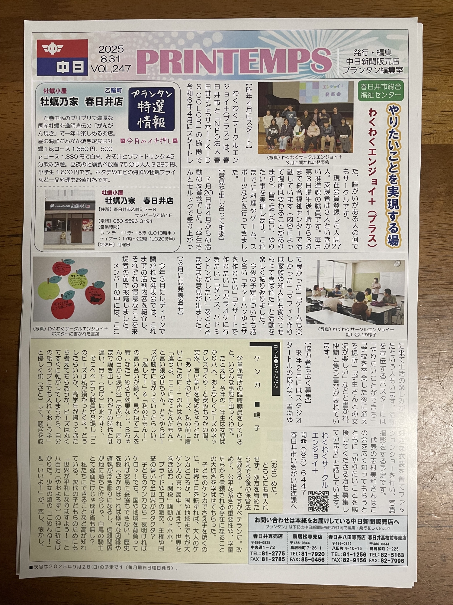 いつもお世話になっている中日新聞の岡村記者さんがエンジョイ+を取材してくださり、プランタン8月31日号に掲載されました!